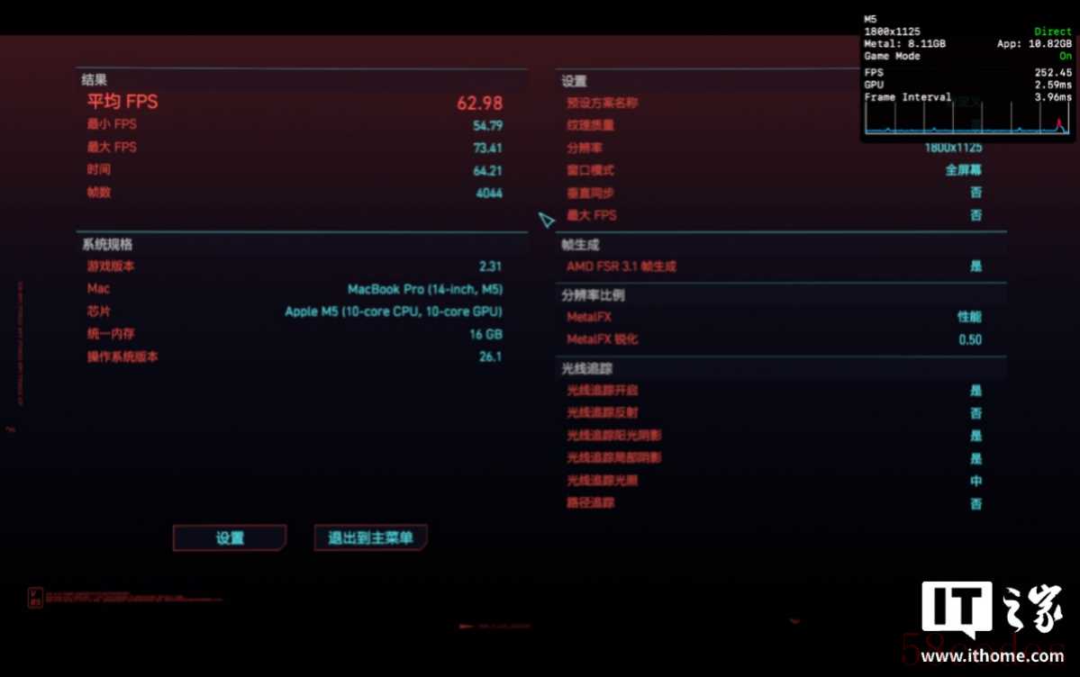 然后我们进一步打开 MetalFX 到性能档,并开启 AMD FSR3.1 帧生成选项,注意这里的帧生成实际上调用的是 MetalFX 的特性,此时游戏平均帧数就可以达到 62 帧。对于搭载 M5 芯片的 MacBook Pro 来说,《赛博朋克:2077》这样性能开销处于第一梯队的游戏,也能优化到 60-100 帧的平均游戏帧数,证明 MetalFX 的效果确实不错,其它大型游戏相信只要做好优化和适配,性能表现只会比《赛博朋克:2077》更好。