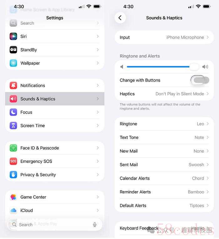 → 设置路径:设置 → 声音与触感,关闭“随按键更改”项。来源:趣聊科技圈微信公众号