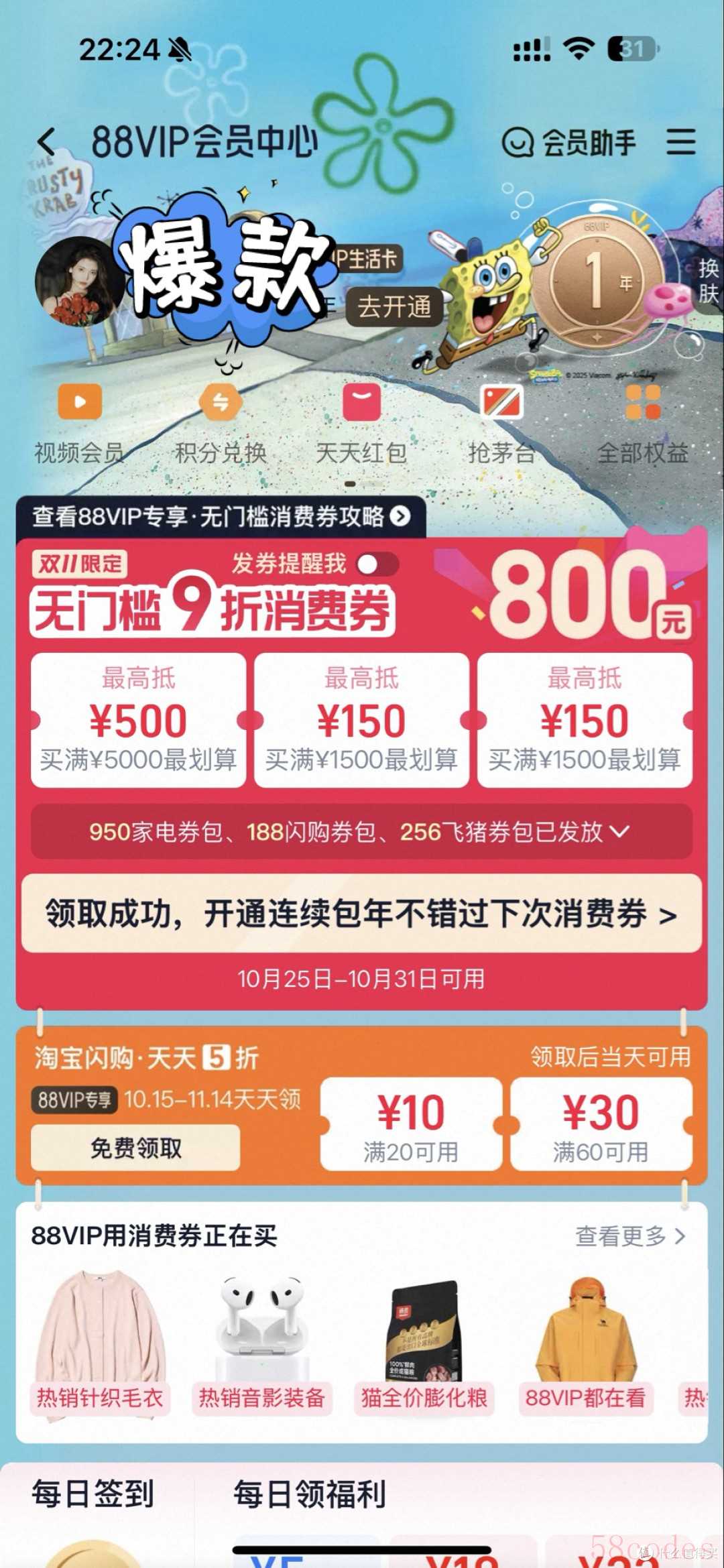 首先淘气值要够,有开通资格,其次开一年88vip,开通后,有几项权益是“0元”购的关键: