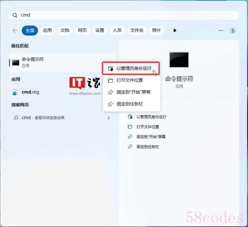 3. 按下 Win 键(或者使用鼠标)打开开始菜单,输入“cmd”,然后选择“以管理员权限”打开命令提示符。