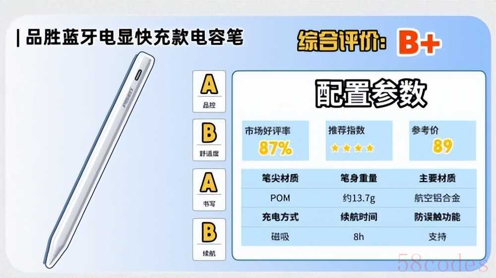 这款电容笔在外观上选用航空级铝合金材质打造,质感出众,同时将重量精准控制在约12克,轻盈便携,长时间使用也无负担。书写上,它的笔尖采用高耐磨的POM材质,书写细腻精准,即便是书写小字也能清晰流畅,还原度高,配合防误触技术,可在iPad上实现边写边支撑手掌的自然书写姿势,大幅提升使用体验。充电方面,它配备Type-C接口,支持快速充电,大约30分钟即可充满,满电后可连续使用约9小时,续航能力足以应对日常学习、办公或绘画需求。不过,相较于市面上多数平价替代产品,其价格略高。
