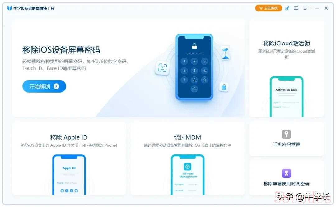 若以上方法均无效,可使用专业工具辅助解锁,移除被锁定的Apple ID,如牛学长苹果屏幕解锁工具。它可以删除iPhone/iPad/iPod上当前登录的Apple ID账号,而且你无需知道任何解锁Apple ID的知识,几步操作即可帮你轻松解决问题。操作步骤:第一步:打开牛学长苹果屏幕解锁工具,在主界面选择“移除Apple ID”功能。