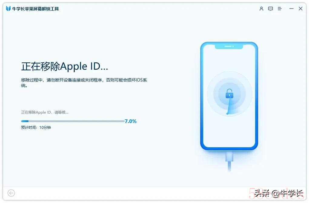 第二步:单击【开始移除】,牛学长苹果屏幕解锁工具会检测到您的Apple ID立即解锁,等待软件解锁完成即可。