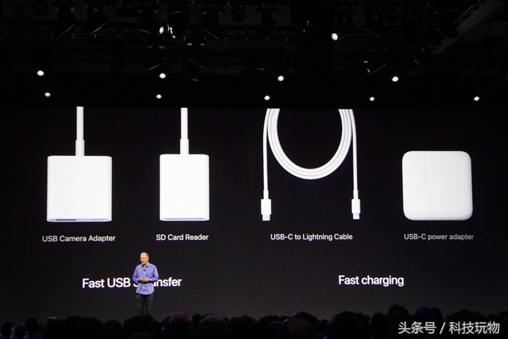 新iPad Pro还是采用Lightning连接端,新iPad Pro可以转接读卡机等配件(因为可以应付轻工作的关系所以有这建议吧),或是另外通过Type-C跟Lightning的转接线,可以用Type-C的充电器(比方MacBook)的充电器快充。(10.5寸内置30.4W电池,12.9寸则是41W电池)