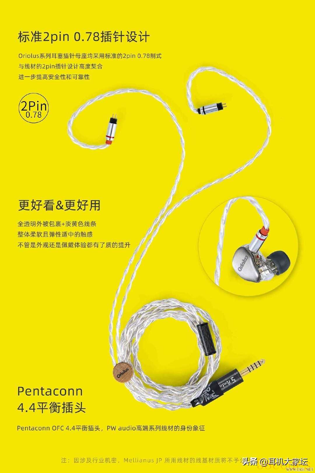 沿用 2-pin 换线设计,附送的全新 4 绞耳机线线身柔软。导体由铜镀银线芯制作,2-pin 插头 及 3.5mm 插头均重新设计,进一步提升传输稳定性。