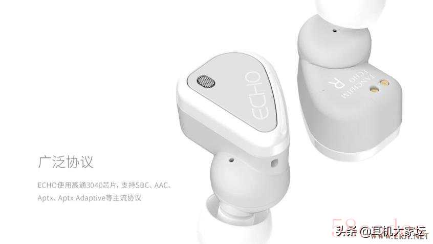 ECHO(回声)真无线耳机同样延续了氧气的经典外形,但为了实现更好的声学腔体环境,ECHO将发声单元腔体与电子元器件腔体部分设计成了两个互不干涉的腔体,ECHO采用了一颗10毫米的动圈单元,去除掉了传统动圈的单元的铜环,使得同等盆架体积上,膜片的有效振动面积更大,同时使用中心引线设计,传统结构的动圈引线在需要用胶水粘合在膜片上,造成膜片工作时产生不必要的分割振动,因为不需要胶水,振动悬架部分也更轻,瞬态、解析相比普通单元有极大提升。除了支持SBC AAC Aptx外,还支持Aptx Adaptive自适应高码率和低延迟技术。续航单体约为6小时,配合充电盒续航约为50小时。