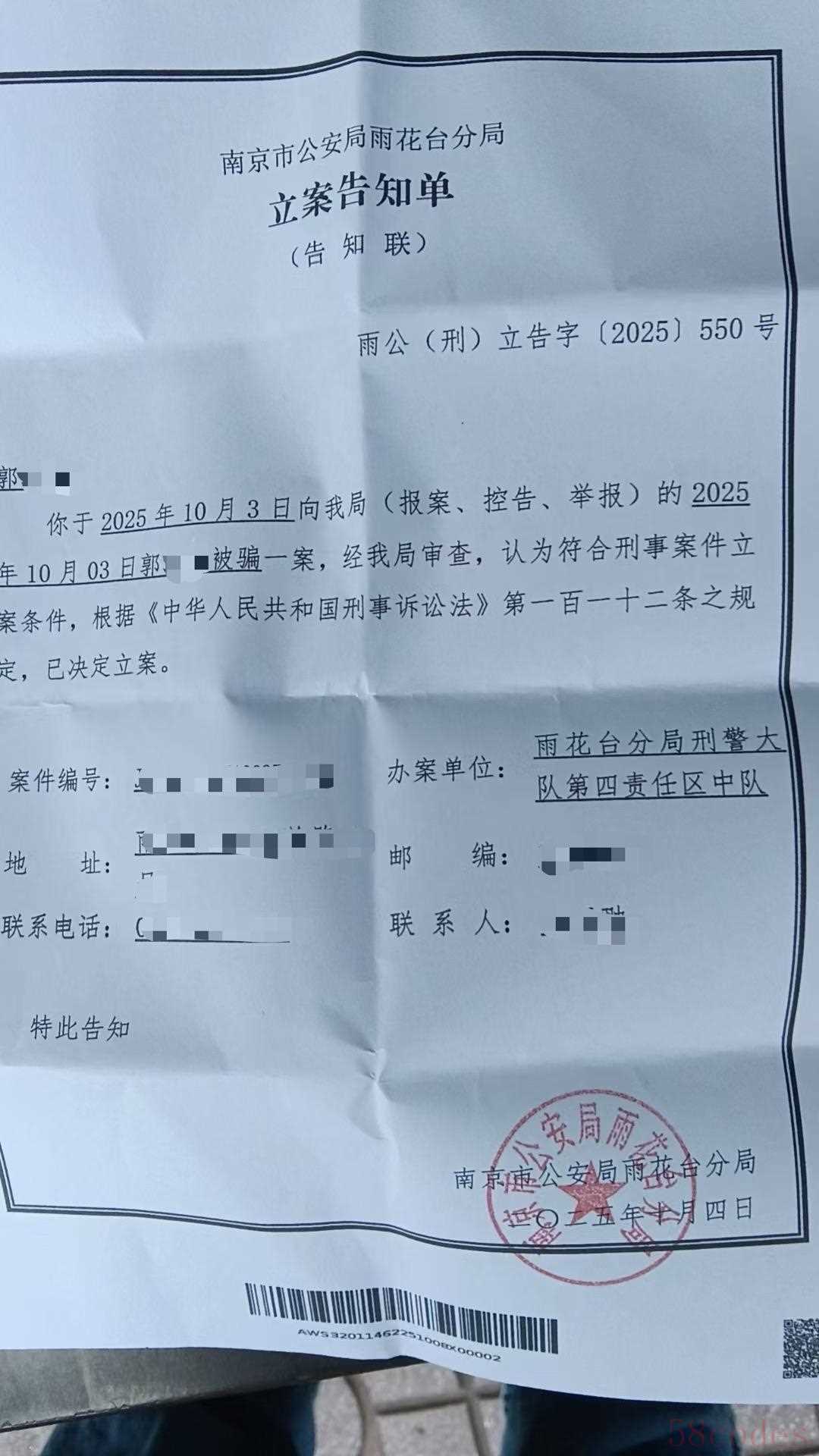 14万余额消失后,郭先生立刻向当地公安报警。据其向红星新闻记者提供的由南京市公安局雨花台分局出具的《立案告知单》显示:该局已于2025年10月4日正式对其被骗一案立案侦查,办案单位为雨花台分局刑警大队第四责任区中队。