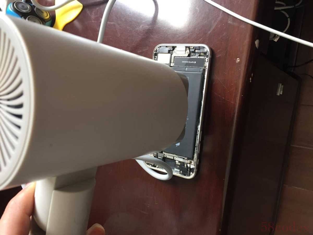7.充分利用电吹风把电池加热,主要是融化电池背面的固定胶。然后用撬棒使劲把撬棒撬下来。
