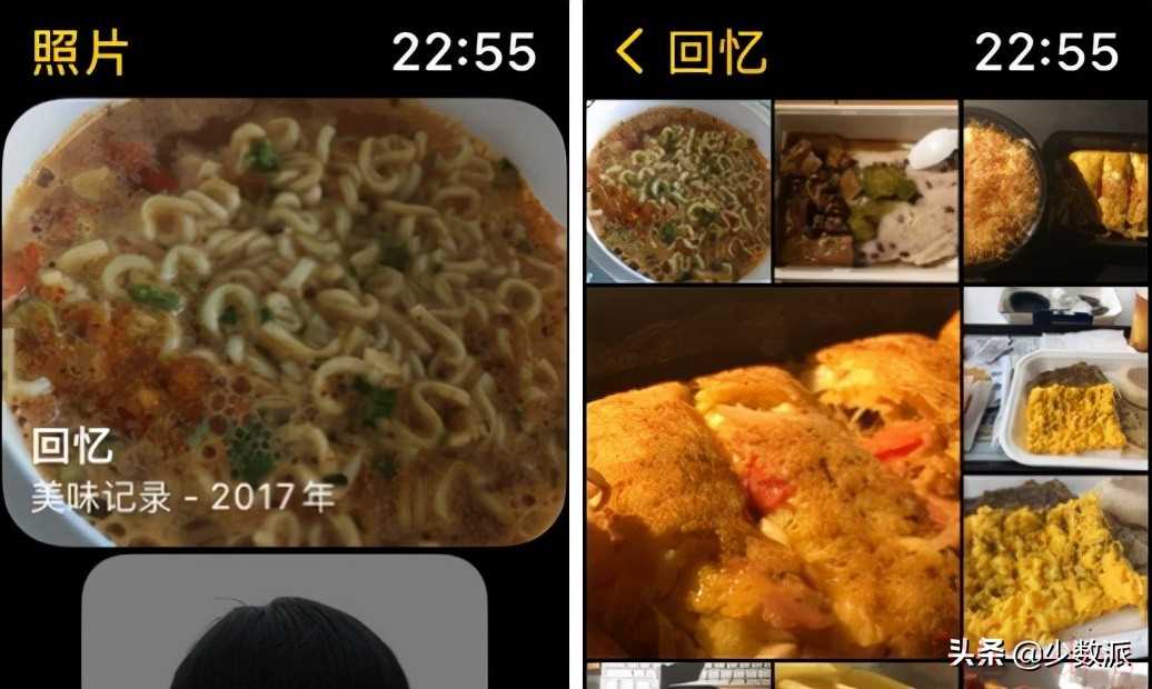 既然 watchOS 为「照片」应用增加了层级,肯定不能只在上面放一个相册。于是,watchOS 8 还将 iOS 的「回忆」功能带到了 watchOS 上。我只需要在 iPhone 上的 Watch 应用内找到「照片」,随后打开「同步回忆」,系统便会自动将我的照片回忆同步到 Apple Watch 上。这些照片会以「回忆」相册的形式在 Apple Watch 上显示。