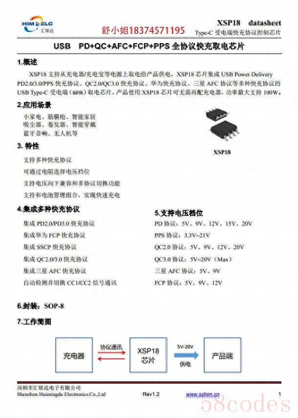 是一种能够模拟符合USB Type-C接口规范的电源管理单元(Power Delivery Unit,简称PDIC)的芯片,它内置了PD模块,通过和供电端(如充电器)的PD协议芯片(如XSP18) 握手通信,可以申请出需要的电压给产品供电。